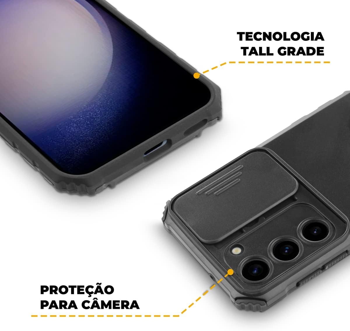 Além disso, a capa conta com uma proteção deslizante na área da câmera traseira, permitindo cobrir completamente as lentes quando não estiverem em uso e deslizá-la para o lado quando for necessário fotografar ou gravar vídeos. Esse mecanismo ajuda a evitar arranhões e danos, garantindo maior durabilidade para o conjunto óptico do seu dispositivo.