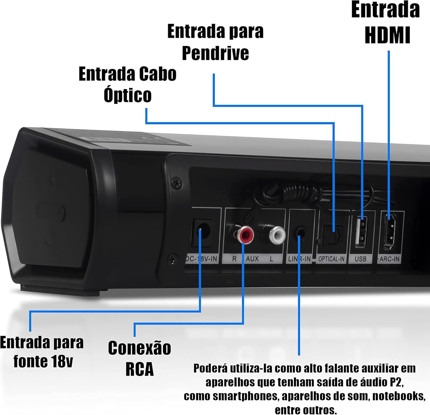 | Conexões de Entrada | USB, HDMI (ARC), Óptica, P2 Line In, RCA Auxiliar |