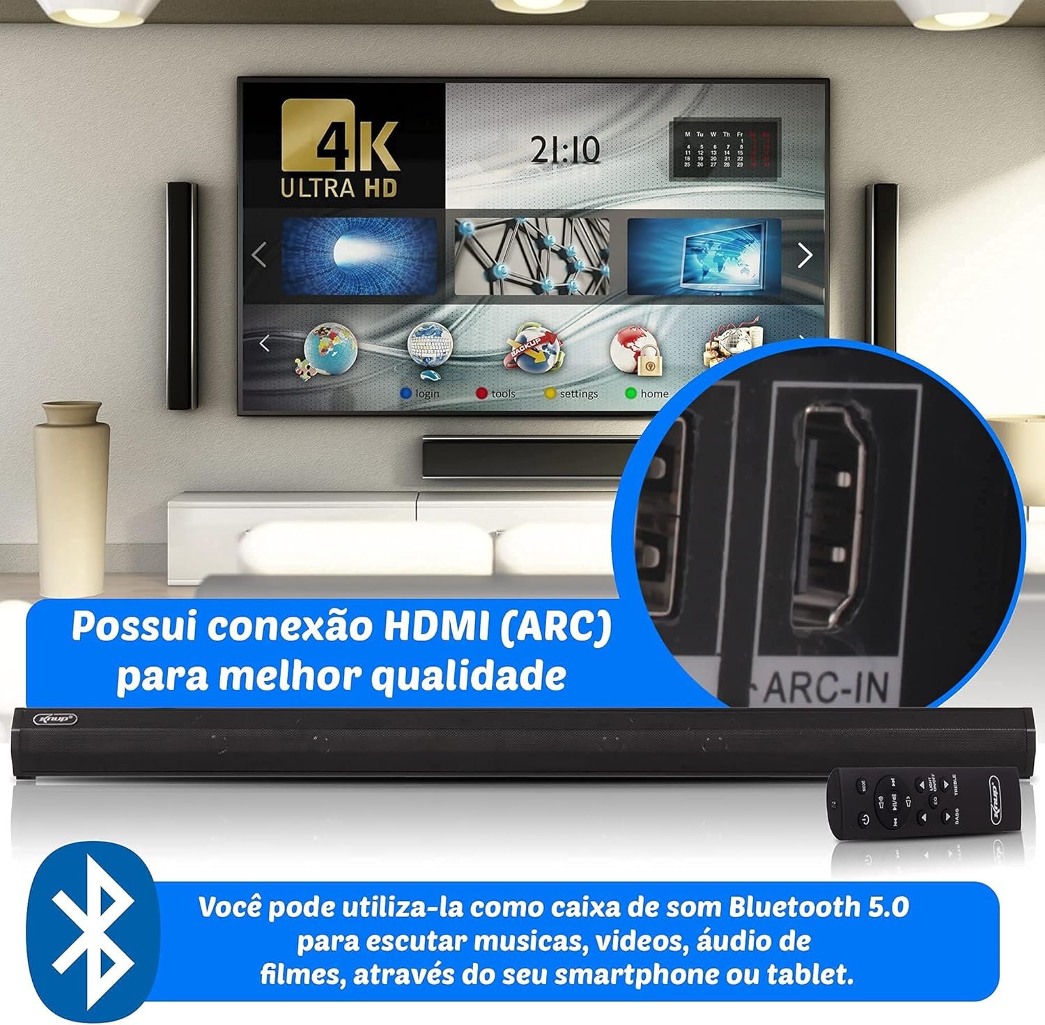 A Soundbar Knup é equipada com várias opções de conectividade, tornando-a extremamente versátil: