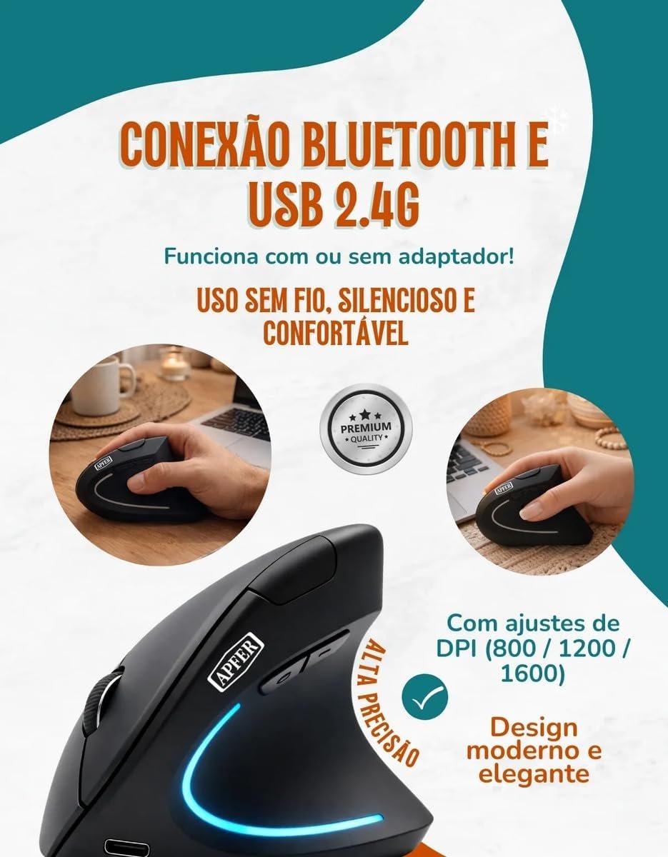 O Mouse Vertical Ergonômico Sem Fio Bluetooth e USB 2.4G combina conforto, tecnologia e praticidade, fazendo dele uma excelente escolha para qualquer usuário que deseja melhorar sua experiência e proteção durante o uso do computador. Com seu design que promove uma postura saudável, cliques silenciosos, conexão dupla e diversas outras características, ele se destaca no mercado como um dos melhores do segmento.