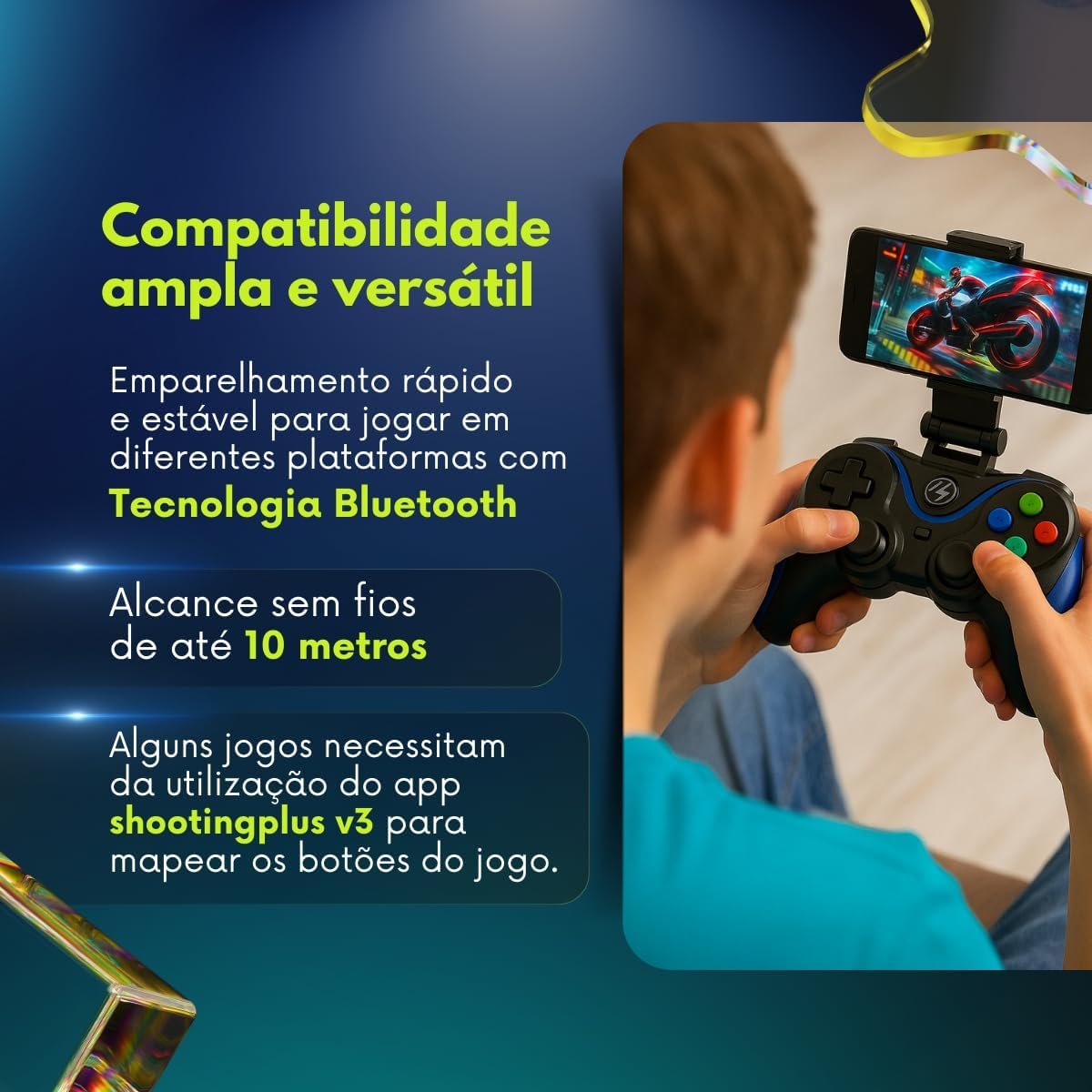 Um dos grandes destaques do Controle Gamer G7 é a sua compatibilidade com diversos dispositivos. Seja em celulares, tablets, PS4, PCs ou Smart TVs, ele se conecta rapidamente via Bluetooth, garantindo total liberdade e flexibilidade para o jogador.