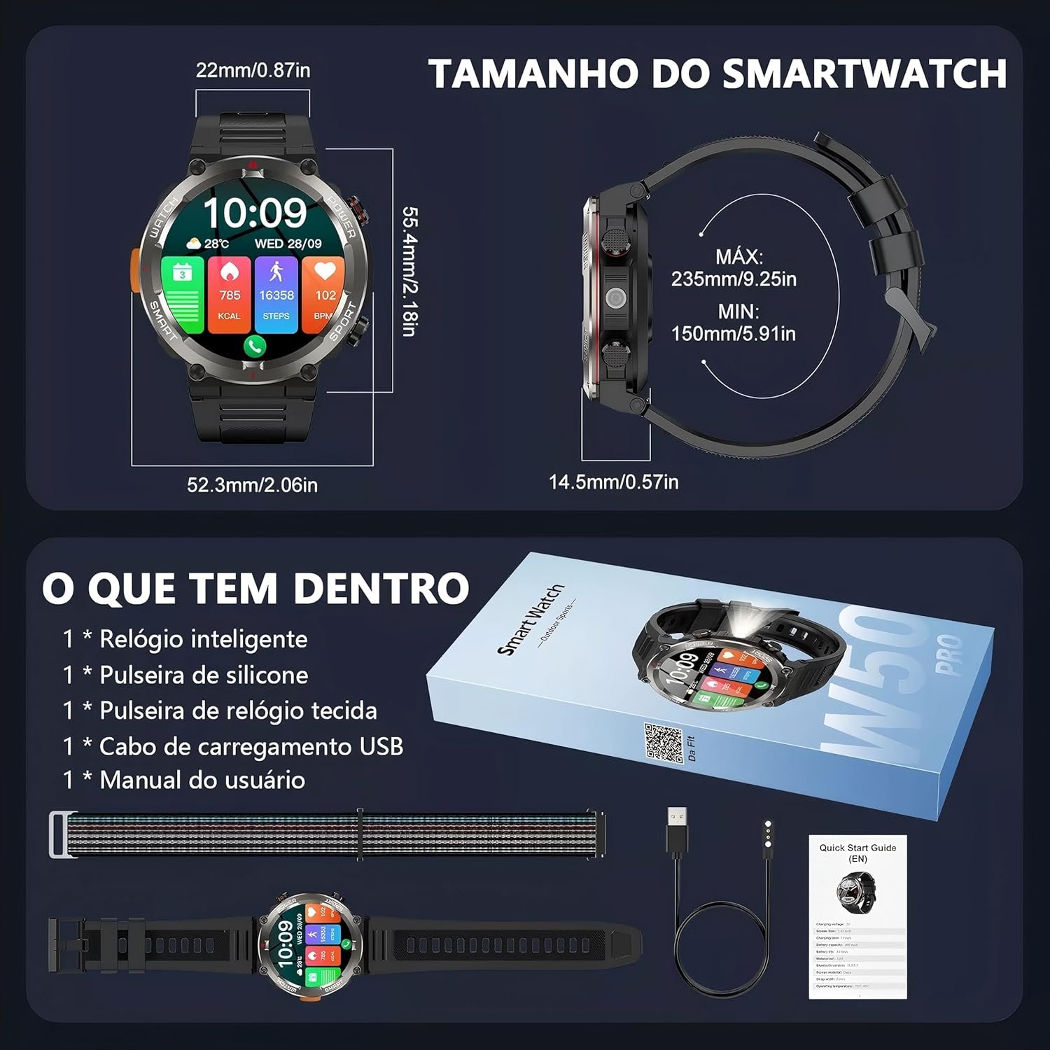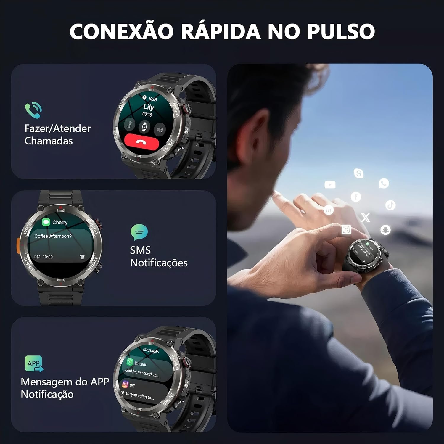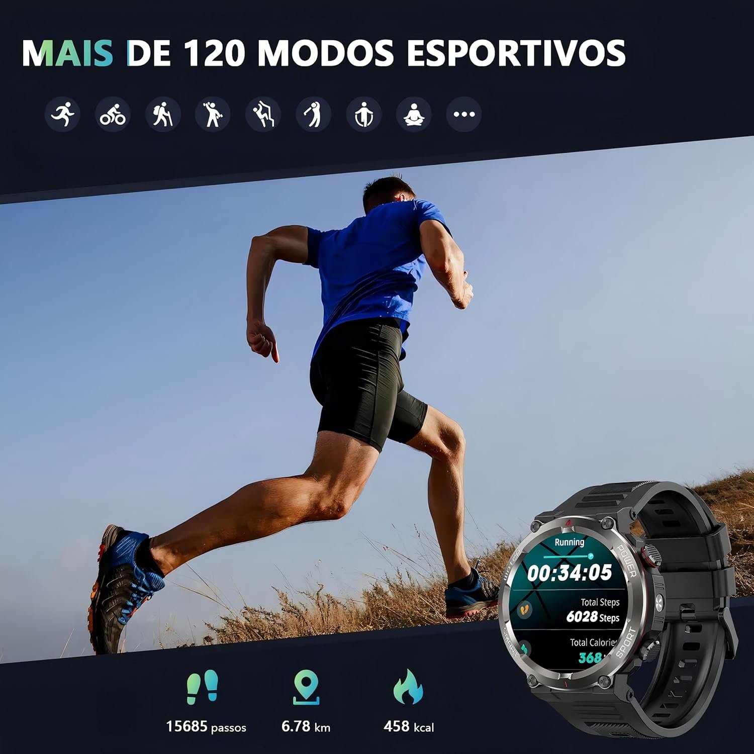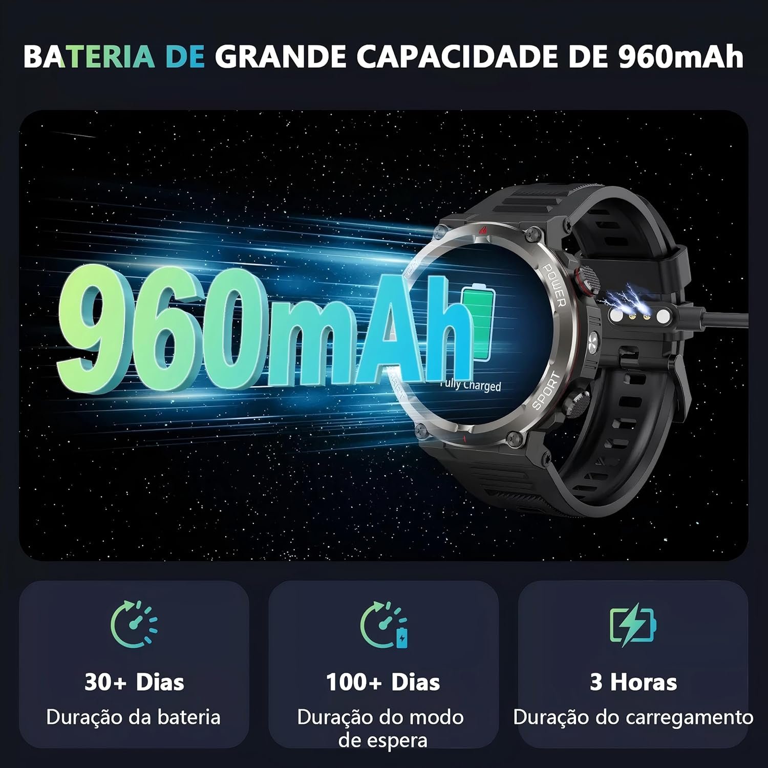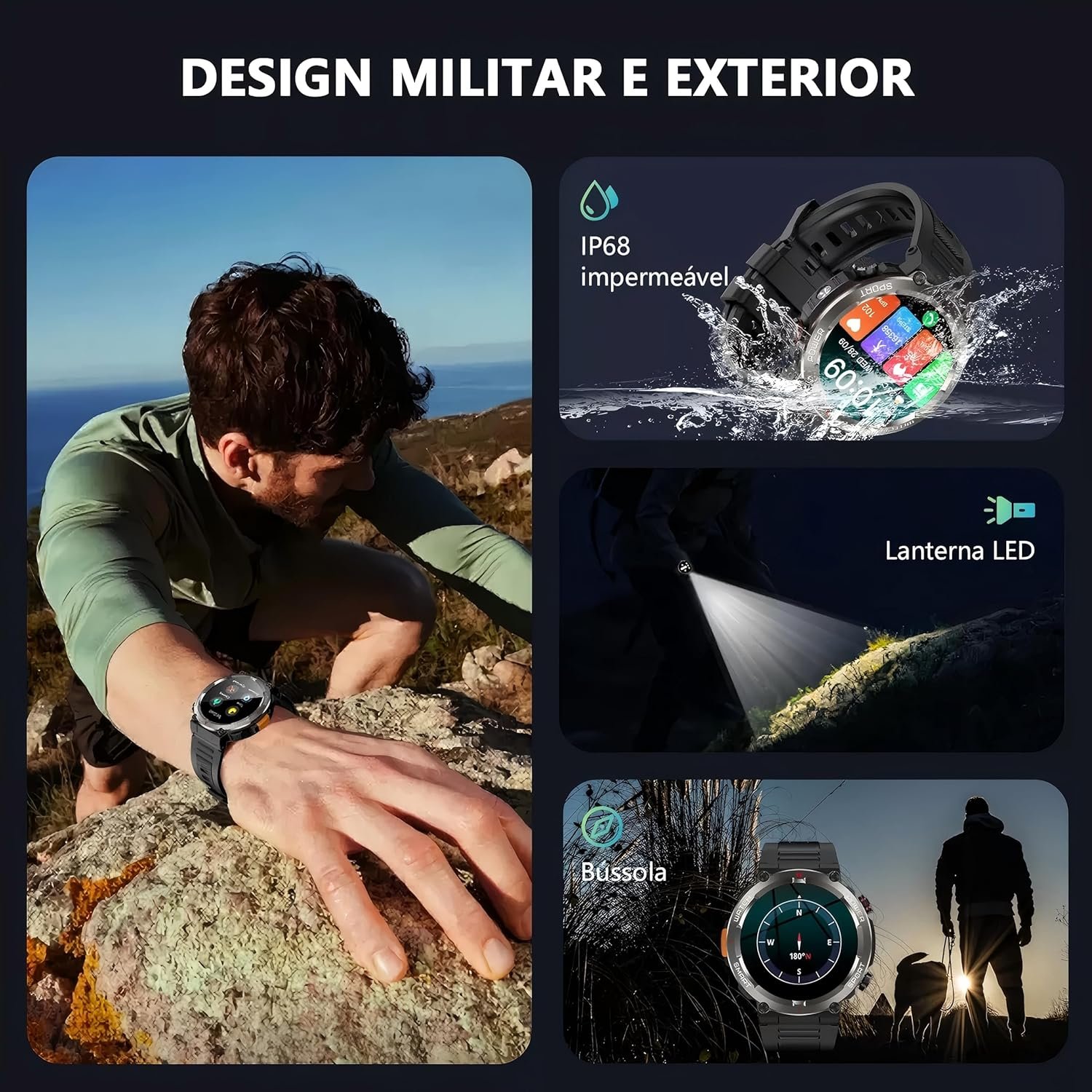Um dos destaques do IOWODO Smartwatch Militar é seu design robusto, desenvolvido para suportar condições extremas. Ideal para aventureiros, este relógio possui as seguintes características: