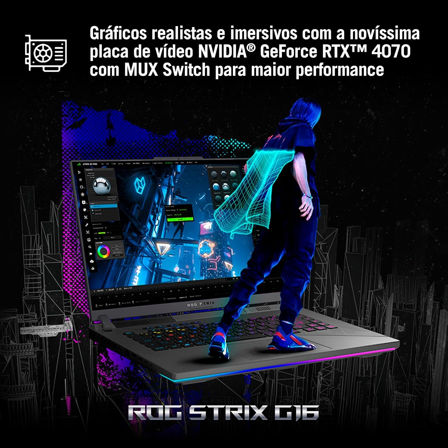 O ROG Strix G16 é equipado com a NVIDIA® GeForce RTX™ 4070, um verdadeiro monstro em termos de processamento gráfico. Esta GPU não só oferece gráficos deslumbrantes, mas também incorpora a nova tecnologia DLSS 3 que promete aumentar significativamente seus FPS nos jogos.