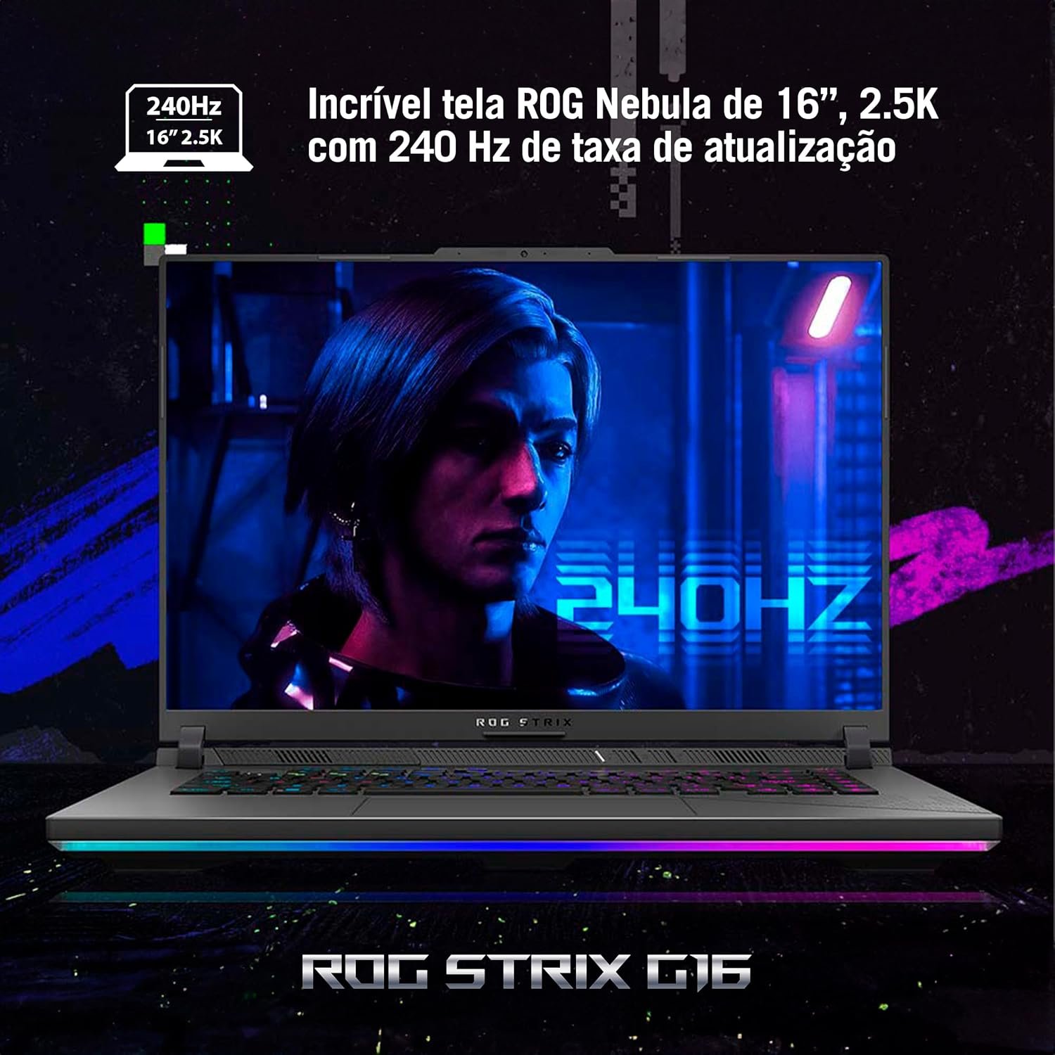 A tela ROG Nebula de 16’’ com taxa de atualização de 240 Hz é um dos destaques do ROG Strix G16. Para gamers competitivos, cada milissegundo conta e, com esta taxa de atualização, você terá uma experiência muito mais suave e responsiva.
