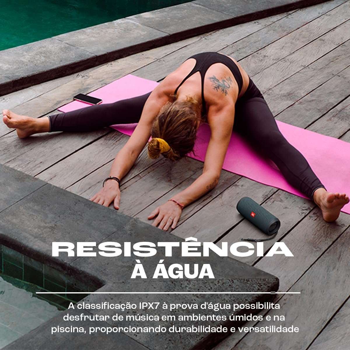 Para aqueles que amam um bom mergulho ou uma festa na piscina, a resistência à água é um diferencial fundamental. A Flip Essential 2 possui uma classificação IPX7, significando que é à prova d’água. Você pode levá-la para a piscina ou usar na chuva sem medo de danificá-la.