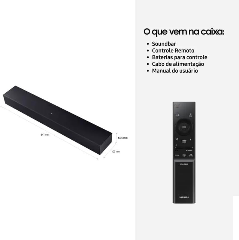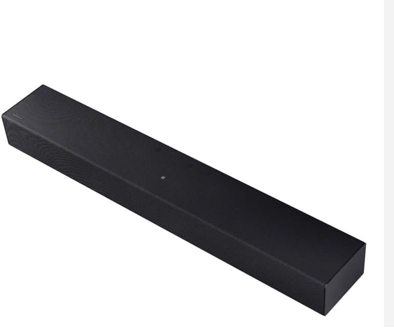 A Soundbar HW-B400F não é apenas um complemento, mas sim uma parte essencial da experiência de entretenimento. Com um som limpo e potente, ela traz vidas às suas músicas, filmes e jogos. Aqui estão algumas características da Soundbar:
