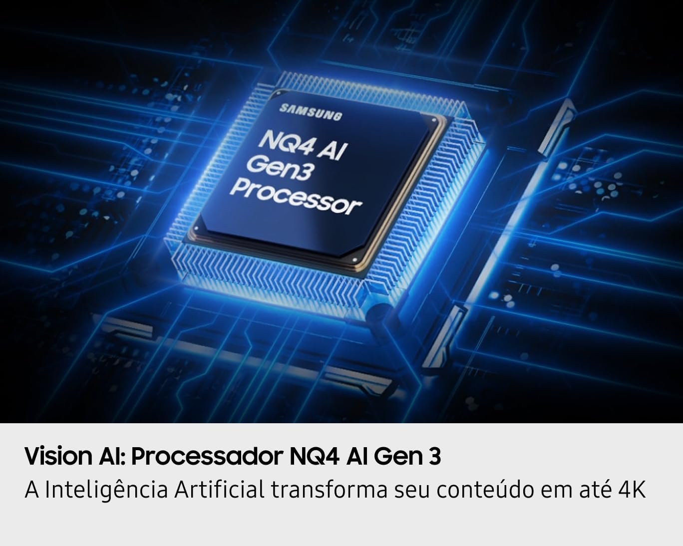 Uma das grandes promessas do Samsung Vision AI é o processamento de imagem através da inteligência artificial. Com o Processador NQ4 AI Gen 3, a TV é capaz de transformar conteúdo SDR em HDR 4K, ajustando brilho e cores para otimizar qualquer tipo de exibição.