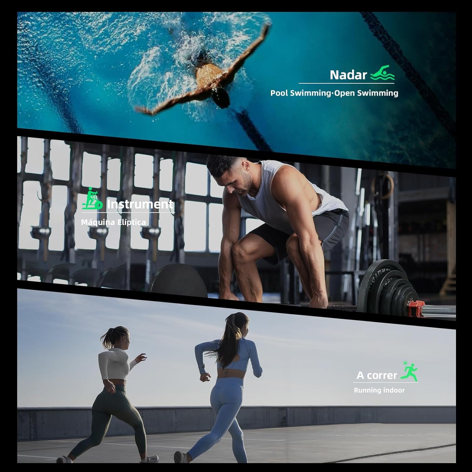 - Suporte para 100 modos deportivos, incluindo:
