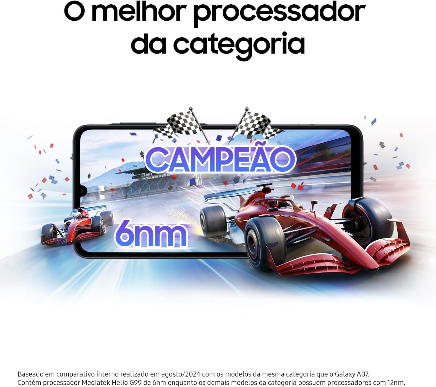 O Galaxy A07 é equipado com o processador Mediatek Helio G99, uma verdadeira potência para a sua faixa de preço. Este chip é feito com tecnologia de 6nm, o que permite um desempenho significativamente melhorado em relação ao seu antecessor, o G85.
